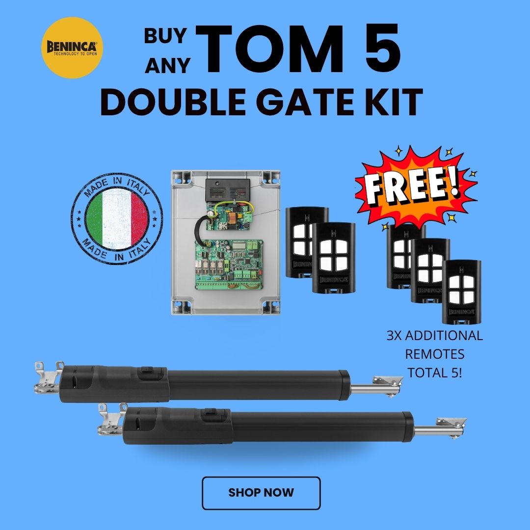Buy any Tom 5 Double gate opener kit and get 3x Free additional remotes valued at $135Instant redemption, claimed at checkout.