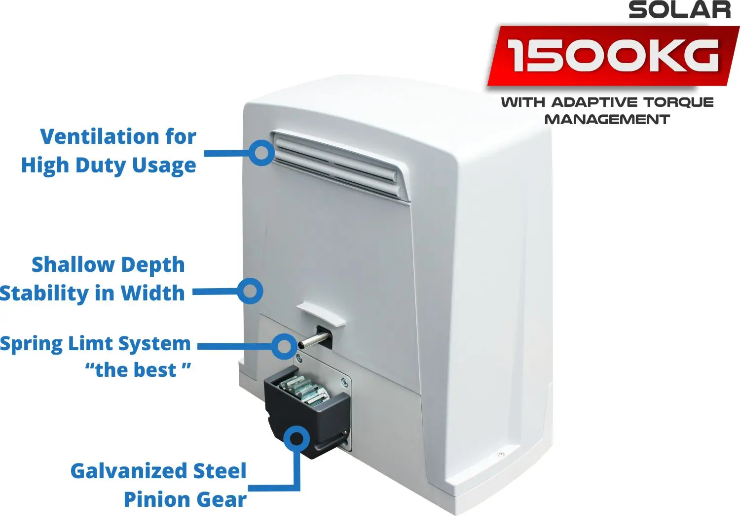 The stopping point at each end is controlled by an easy to setup and durable spring limit system not affected by the Australian climate (unlike magnetic limits).